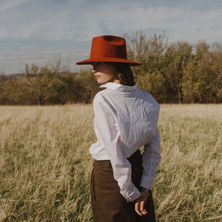 Klassisch und doch auffällig. The Erika Hat wird aus 100 % Wolle in Le Marche, Italien, hergestellt. Seine schlichte Struktur sorgt für klare, elegante Linien, während die feste, breite Krempe ihre Form behält und die Sonne abhält. Ein unverzichtbarer Hut für gehobene Kapselschränke, minimalistische Kleiderschränke und alltägliche Ausflüge.